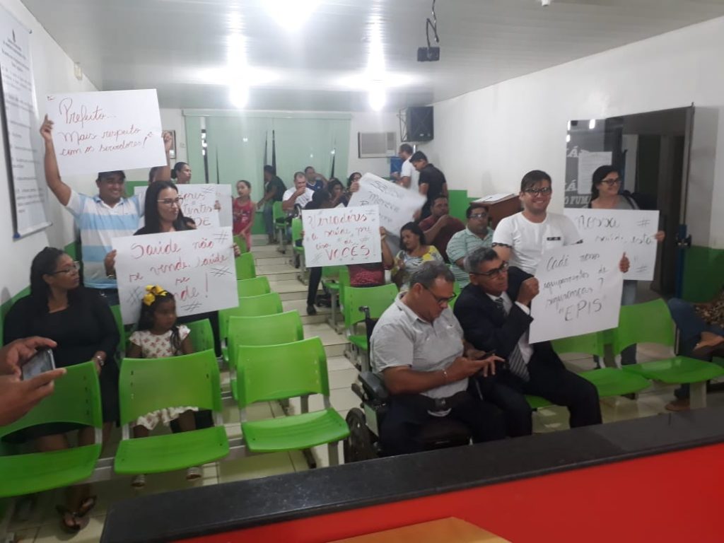 na noite desta segunda-feira(2/12), aproveitando a sessão ordinária da Casa, protestar, reivindicar seus direitos e pedir a intervenção dos vereadores para combater o que chamaram de “injustiça” pratica pela administração do prefeito Leomar Patrício (PHS).